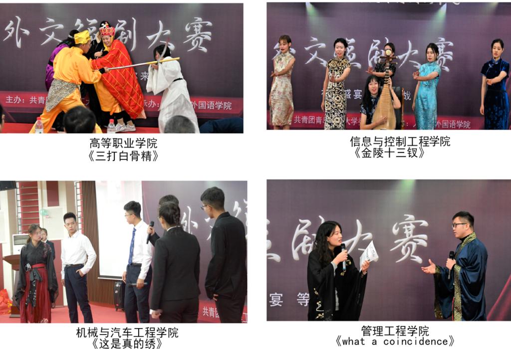 本次大赛共有来自我校各兄弟学院的7支参赛队伍。首先上场的是信息与控制工程学院代表队,他们带来的《金陵十三钗》以编剧中的角色冲突和极强的舞台表现力,引得台下惊叹声四起。琵琶和舞蹈的加持,使得他们的表演更具感染力。管理工程学院代表队以《what a coincidence》为题的短剧表演,该剧以古今服饰相异的冲击下,传统和现代四大发明仍有碰撞与巧合,突出了主题中的中华文明一脉相承之理。机械与汽车工程学院代表队上演的《这是真的绣》,通过短剧赞美了中国的传统工艺,更寄予了中国传统工艺走出国门的希望,表演极富有感染力,引发了台下观众对于传统工艺的赞美之情。高等职业学院代表队带来的《三打白骨精》,剧中动作表情极为传神,极具喜剧效果,也引得台下哄堂大笑。人文与外国语学院代表队的《你光明,中国就不黑暗》,通过抗战时期中国形势之残酷和新时代中国现实之美好,通过现代人对先人的缅怀,说明了幸福生活的来之不易,引起了观众的共鸣。理学院带来的《林黛玉进贾府》,以宝玉摔玉引至节目高潮,带给了大家不同的视觉感受。最后一个上场的是商学院,他们带来的作品是《学习雷锋好榜样》,展现了雷锋精神的一脉相承,呼吁争做正能量的新时代大学生。各代表队传神的动作、精湛的演技、深刻的作品思想,让现场观众频频鼓掌。评委们根据参赛队伍的舞台展现力、剧本的连贯性、语句发音是否准确及现场表现的整体效果等标准进行综合考量作出公正的打分。