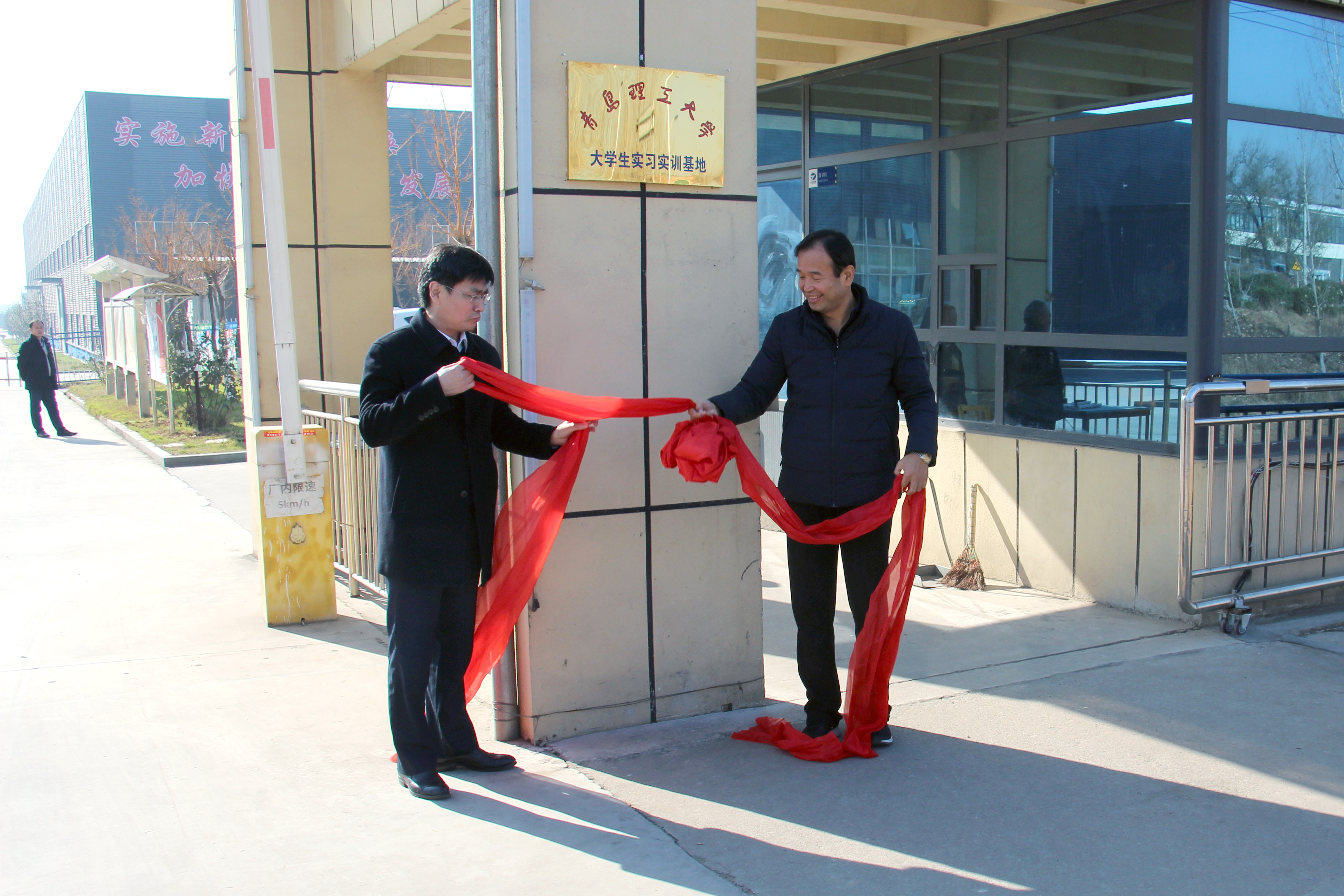会后李国涛与张金山共同签署校企合作协议并为“青岛理工大学大学生实习实训基地”揭牌。