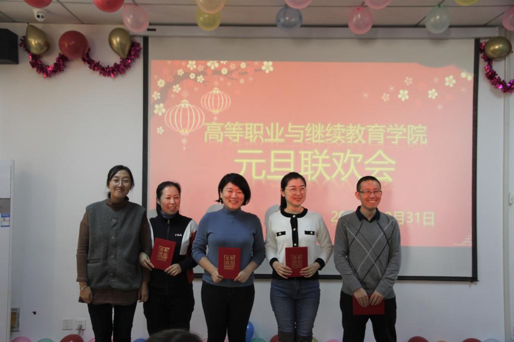 党总支书记孟凡勇宣读了《高等职业与继续教育学院关于表彰2019年度先进个人的决定》,学习强国标兵、校区搬迁先进个人、爱岗敬业先进工作者、工会工作先进个人、工会活动积极分子、青春活力奖、快乐运动奖等获奖个人先后上台领奖,学院领导为获奖个人颁奖。