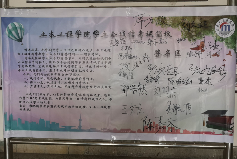 临近期末考试,为了严肃考试纪律,营造良好考风,土木工程学院学生会向学院全体同学发起倡议,期末考试自觉遵守考风考纪,做一名诚信大学生。