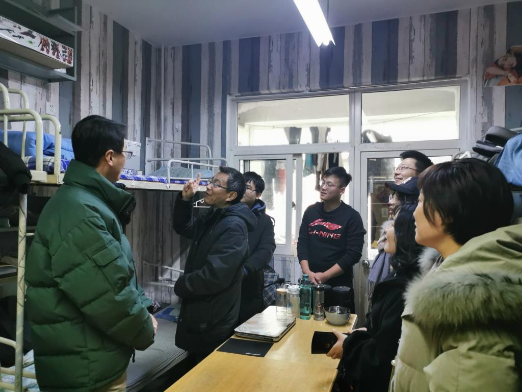 1月9日上午、10日下午,建筑与城乡规划学院党总支书记肖学斌、副书记高江、学生工作办公室主任王鹏飞带领辅导员李岩、刘超、杨霈宣、王明慧、郭轶群走进学院北院1公寓、3公寓、4公寓、甲楼、宏业本科生、研究生学生宿舍,了解学生离校情况,了解学生期末学生思想动态,排查安全隐患,督促学生做好宿舍安全防范工作。