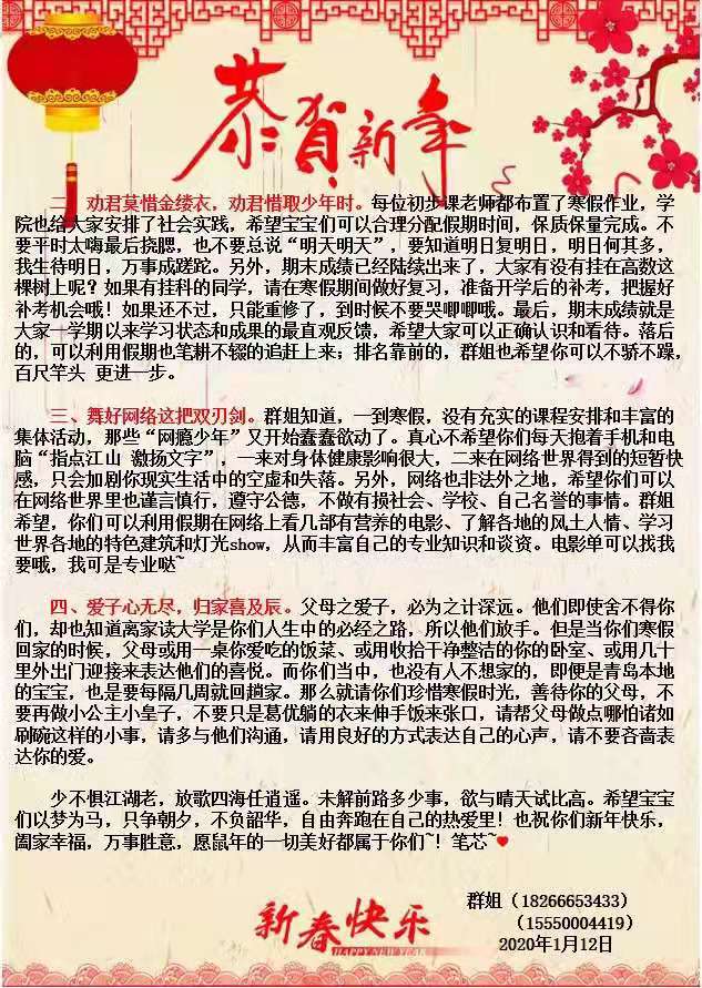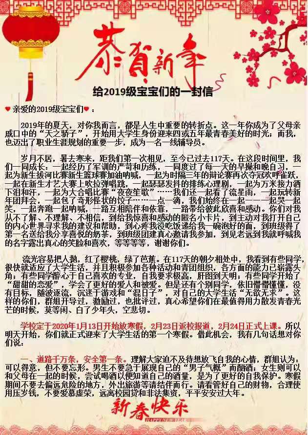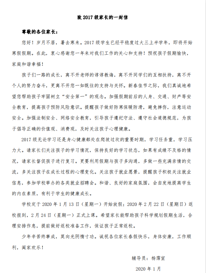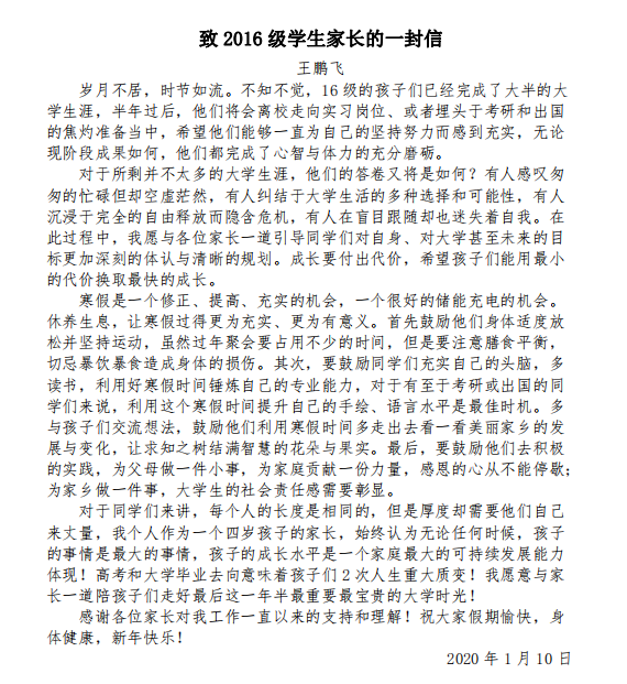 同向同行,跟家长说说心里话。学院学生工作办公室主任、分团委书记、16级辅导员王鹏飞为学生家长写了一封亲笔信。他在信里希望家长能够“多与孩子们交流想法,鼓励他们利用寒假时间多走出去看一看美丽家乡的发展与变化,让求知之树结满智慧的花朵与果实。”字里行间充满了对即将毕业的同学们的关怀,充满了对家校进一步合作的期盼。