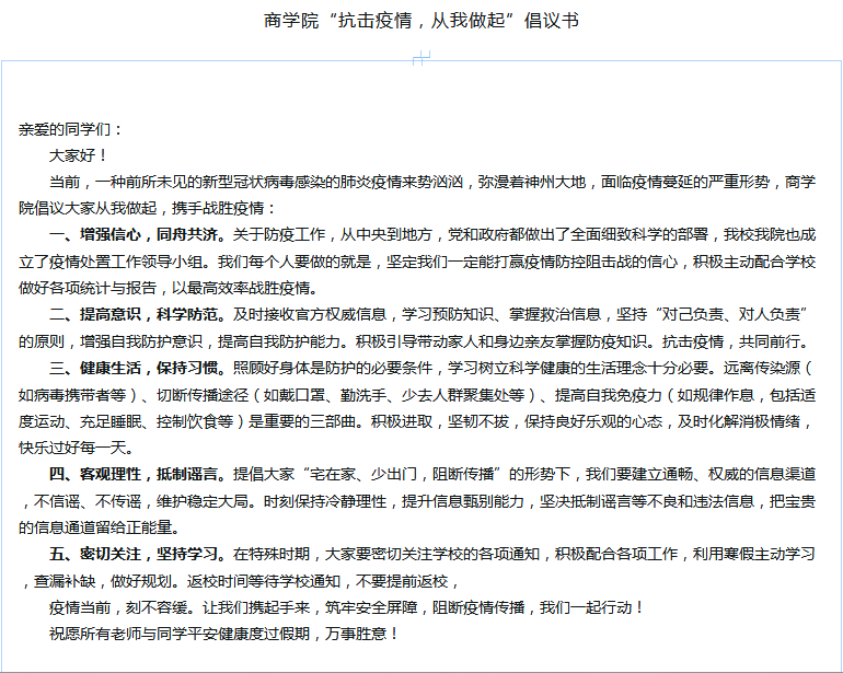 倡议书总结了远离传染源、切断传播途径、提高自我免疫力科学防疫三部曲,并提倡大家时刻保持冷静理性,提升信息甄别能力,坚决抵制谣言等不良和违法信息,把宝贵的信息通道留给正能量,要积极相应国家和社会的号召,主动配合学校和学院的相关工作,满怀信心,从自身做起,为打赢这场没有硝烟的战争贡献自己的力量。