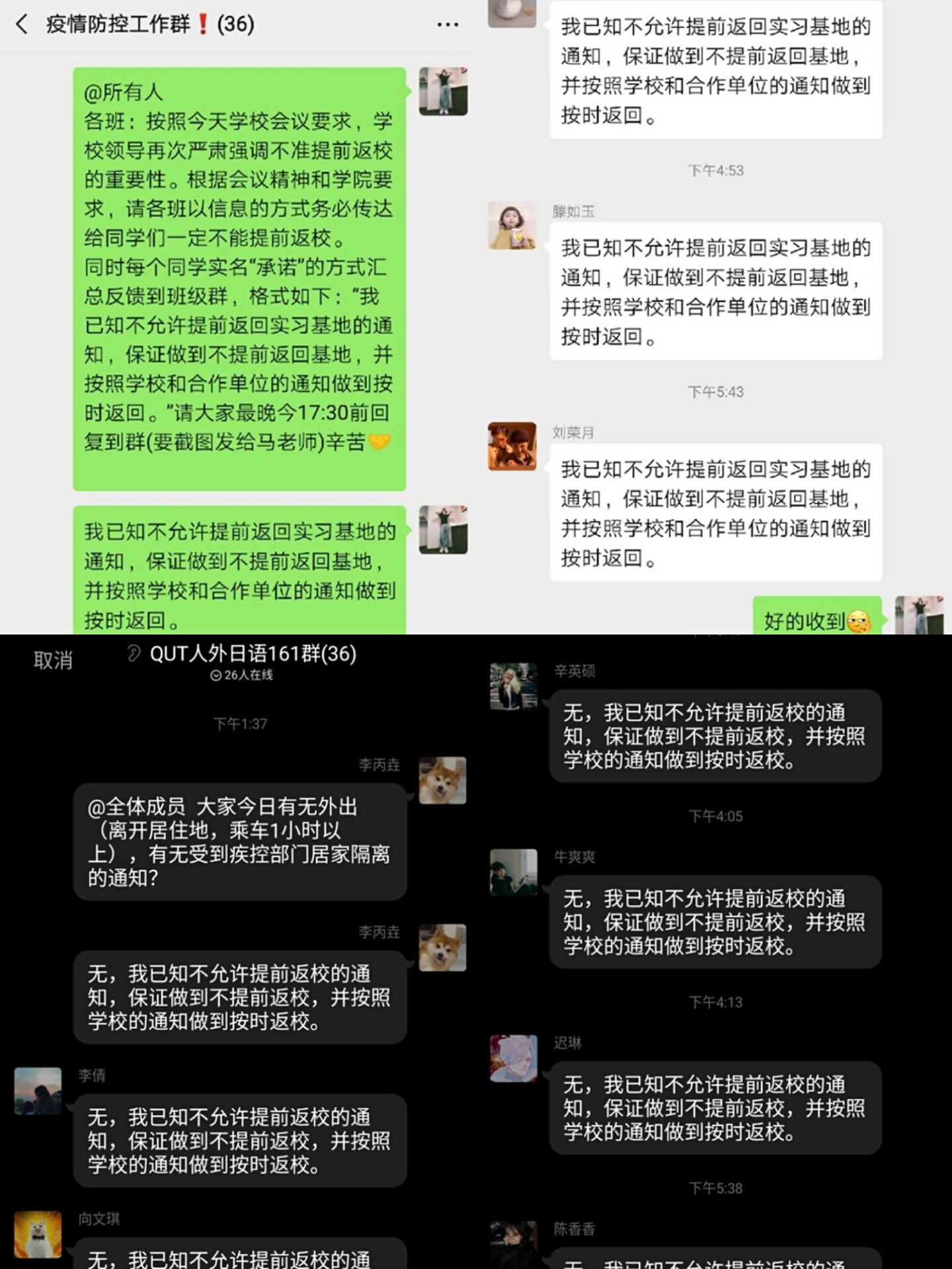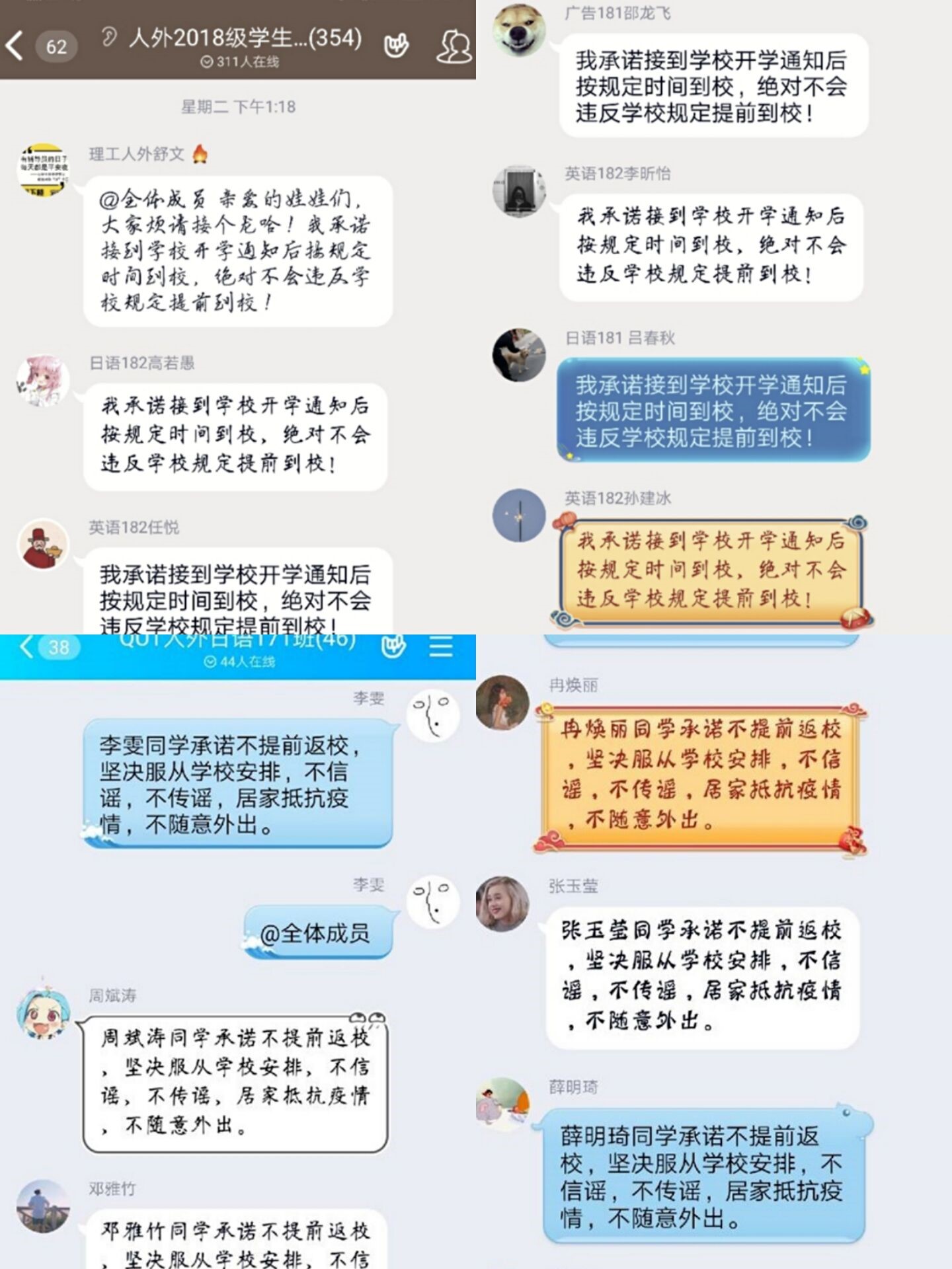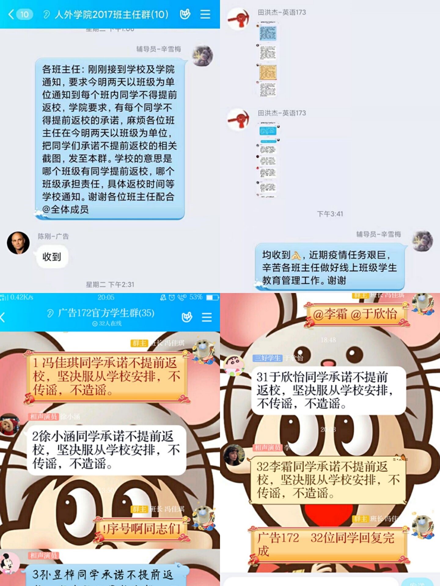 各年级辅导员严格贯彻落实领导指示,结合学校疫情联防联控工作方案,迅速开展防控工作。2019级辅导员陈刚为19级学子发送防控短信,强调务必不要提前返校、减少人员流动、保护自身生命健康、维护学校和社会安全稳定等细则。2018级辅导员贾舒文在年级群中发起“我承诺接到学校开学通知后按规定时间到校,绝对不会违反学校规定提前到校!”线上接龙的号召,得到同学们的积极响应,同时她利用易班、微信等融媒体平台呼吁学生关注学校学院防控专题,并举办新型冠状病毒肺炎相关知识普及、健康防控措施教育、线上直播教育、抗疫征文、抗疫漫画等活动,注重学院师生心理健康教育,有效增强学生对疫情变化的了解,进一步增强学生的防控意识,同时发动家长群力量,及时转发学校、学院最新通知,确保家校联动。2017级辅导员辛雪梅通过年级群、班级群等各种线上渠道,对学生进行线上教育引导工作,同时做好宣传教育引导及舆情管控工作,确保年级学生网络言论的正确方向,年级同学均承诺不信谣、不传谣,未接到学校开学通知,不提前返校,在家做好学业规划等。2016级辅导员马松充分发挥班主任、学生骨干、舍长的三级网格化作用,积极开展疫情知识普及、防疫教育、信息统计反馈等工作。马松以“我已知不允许提前返校的通知,保证做到不提前返校,并按照学校的通知做到按时返校”为口号在班级同学中得到积极反馈,达到全覆盖、全知情的理想效果。
