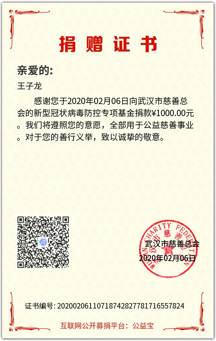 电气183班王子龙同学一直关注疫情相关的新闻,看到全国各地医护人员主动请战支援疫情一线,他深受感动。2月6日,他主动从生活费中拿出1000元捐赠给武汉市慈善总会,用于武汉市新型冠状病毒防控工作,为抗击疫情贡献自己的绵薄之力。同时,他联合社区的几名大学生一起加入郯城县檀都小区服务队,在社区门口参与体温检测、疫情预防宣传和物资发放等工作。虽然有身体的劳累和父母的担心,但为自己能对防控工作做一点奉献而感到高兴。