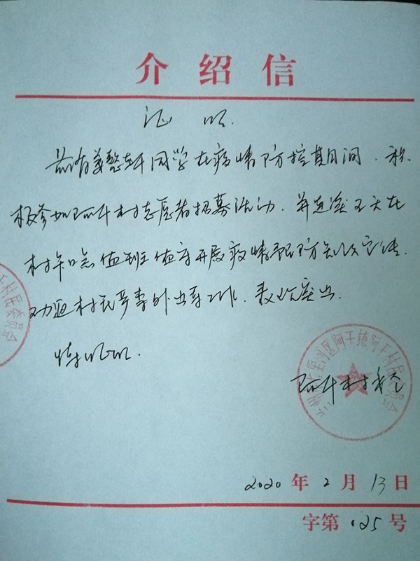 家住甘肃省兰州市的姜懿轩,是青岛理工大学艺术与设计学院的一名大二学生,在加强自我防护的前提下,她主动协助社区开展疫情防控志愿者服务工作。协助村委会向广大居民宣传自我防护知识,及时了解负责区域常住人口、外来人口和返乡人员情况,协助开展出入人员、车辆排查和登记等工作,为每位人员测量体温。在这个全国抗击疫情的形势下,作为一名新时代的青年大学生,为家乡付出自己的一份绵薄之力。虽然外面寒风刺骨,但是仍然愿意站在防控第一线,尽己所能。更体现出作为一名共青团员的责任与担当,也增强了自己战胜困难的勇气,体现了为人民服务的优良品质。