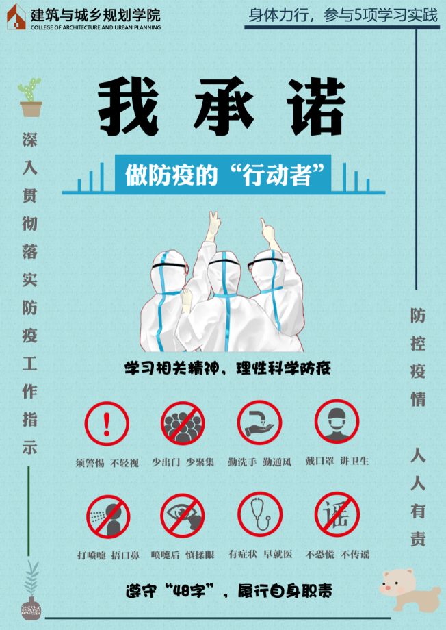 众多作品中,城规172班王越同学制作一套“我承诺”的主题海报,用一组组简单生动的图片,号召大家做防疫的“行动者”、科学的“传播者”;城规191的吕瑞倩同学则选取了向死而生的“逆行医护人员”作为海报的中心内容,搭配恬淡的主题风格令人泪目,表达出对医护人员的美好祝愿;建学182吴明皓同学则精辟蹊径,采用了互联网上很火的“椰树椰汁”设计版式,也非常引人注目,起到了别样的警醒作用……一幅幅生动感人、主题鲜明的海报,凝聚人心,增强信心,传递着正能量,传播着正确的防控方式以及和中央有关防控工作的精神和要求,建筑与城乡规划学院的学生用炙热的心和生动的画表达着自己对疫情的关注与贡献,让我们看到了新时代大学生的家国情怀和时代担当。