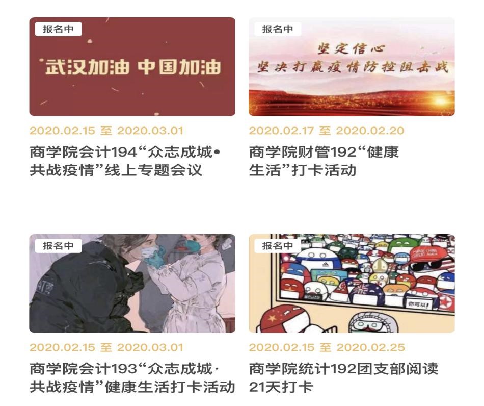 党旗所指就是团旗所向,商学院分团委积极响应党总支号召,创新方式方法,开展了丰富多彩的线上活动,确保疫情防控期学生活动不掉线。截止2020年2月14日,商学院以“众志成城·共战疫情”为主题,共开展了294项特色团日活动。经济172班团支部用制作H5的方式向大家积极宣传新冠病毒的预防和实时现状,提倡大家用自己的方式默默地与疫情“战斗”;统计181班团支部组织班级同学用歌声声援武汉,温暖大家的不安而坚定的心;经贸182班团支部制作视频致敬所有为疫情奔忙的人们,赞颂一线工作人员恪尽职守的精神;营销191班团支部积极组织团员们写信致敬逆行者、感谢疫情奉献者……不仅仅是线上主题团日活动,商学院的青年学子们还在学工办老师的指导下,发起了“线上口罩互助行动”,倡导班级同学互帮互助,为口罩紧缺的同学寄去口罩,也寄去了关心和友谊;他们发起了“规律运动,健强体魄”室内健身打卡活动,利用家中的哑铃、篮球、乒乓球、瑜伽垫等健身运动器材,积极进行线上室内健身“打卡”;他们发起了“抗击新冠肺炎,我家如何行动”、“家庭即兴小剧场”等活动,通过趣味性活动引导学生学会自强自律、尊老爱幼、文明礼貌,自觉践行新时代公民道德……商学院以党建为引领,以群团为纽带,引领广大青年积极参加线上活动,为打赢疫情阻击战贡献力量。