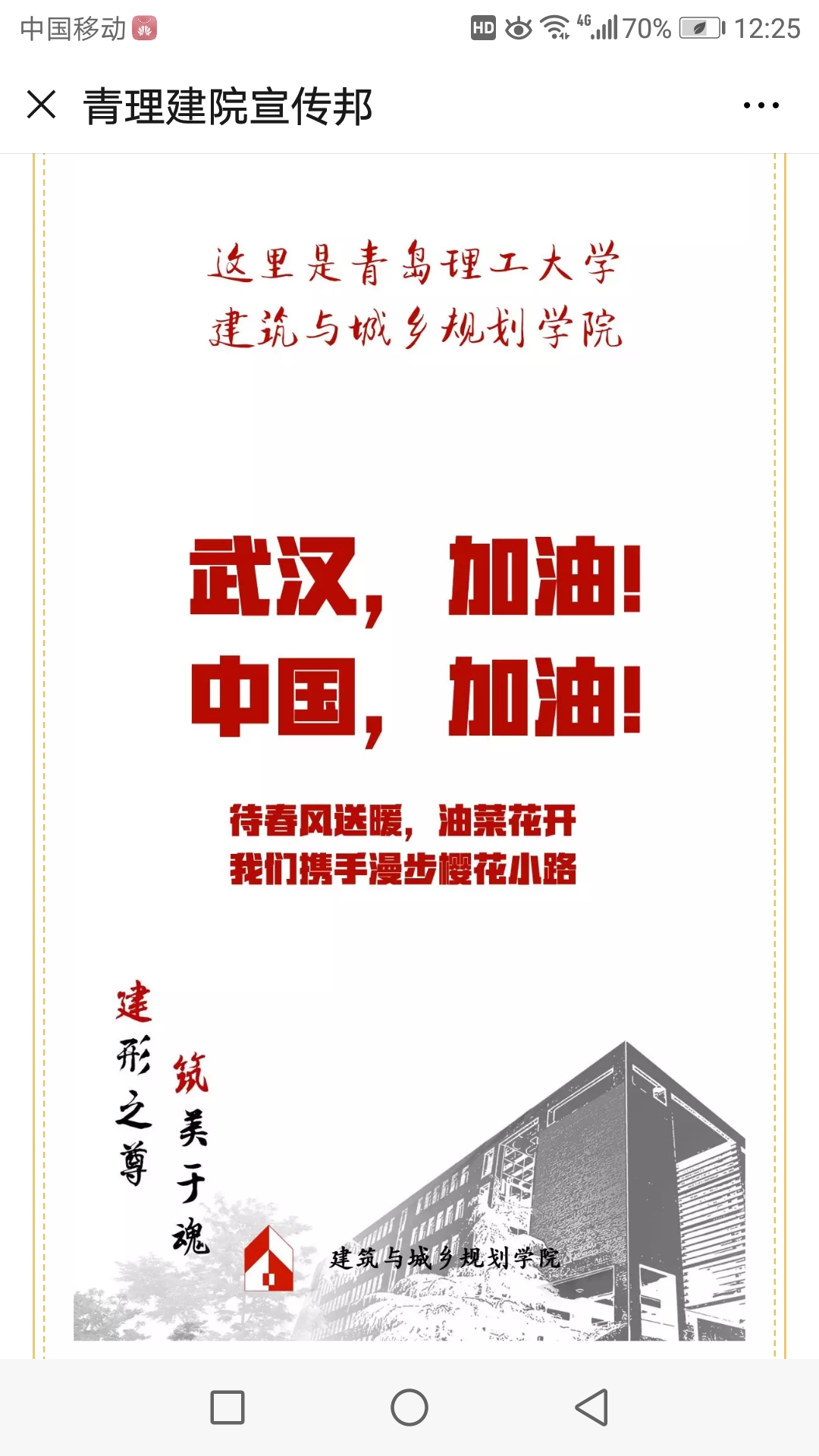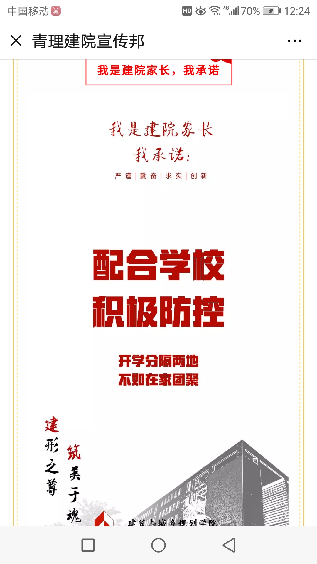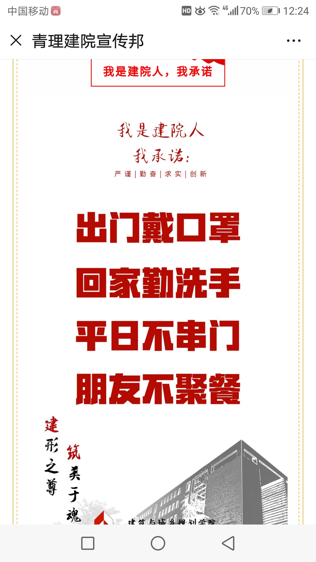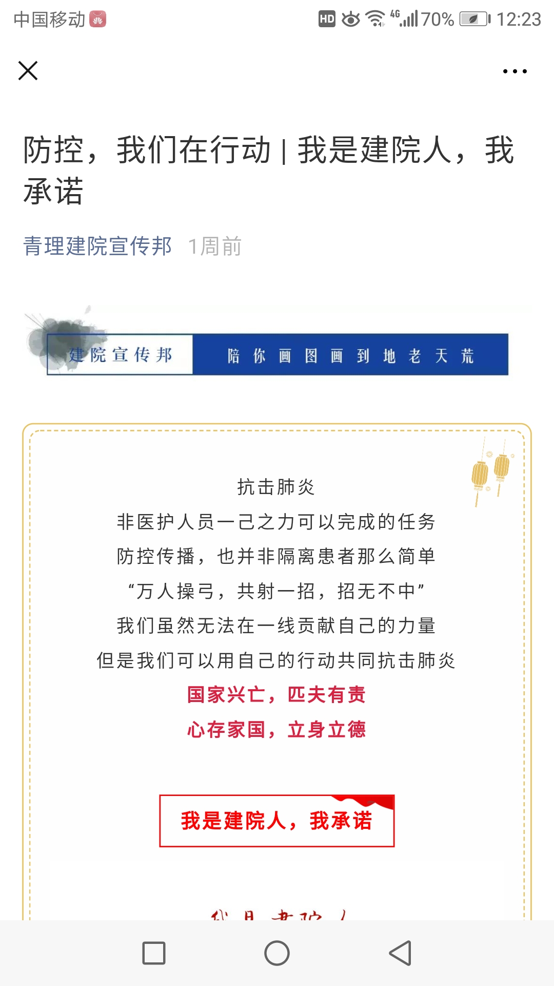 日前,在学院疫情防控工作领导小组的统一组织下,“我是建院人,我承诺!”网络宣传承诺活动在青理建院宣传邦微信公众号上发布,广大教师和学生积极响应,大家陆续在朋友圈转发起来,纷纷接力。大家通过微信平台,做出庄严承诺:我是建院人我承诺:出门戴口罩,回家勤洗手,平日不串门,朋友不聚餐;勤画图,多建模,锻炼身体,背英语;用学习应对空闲,光阴不被虚度;不信谣,不传谣,不造谣,远离虚假,相信科学;不隐瞒,不回避,发现问题及时上报;以身作则,严格监督,我的学生,一个也不能丢;我的职责,一点也不能落;配合学校积极防控;开学分隔两地,不如在家团聚。武汉加油!中国加油!
