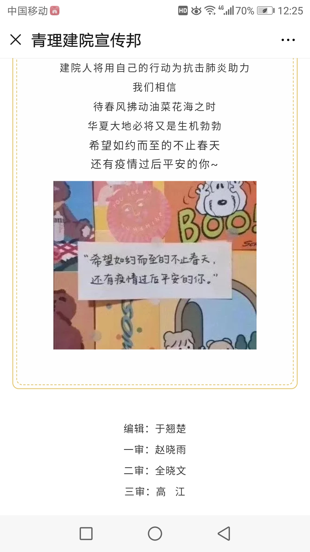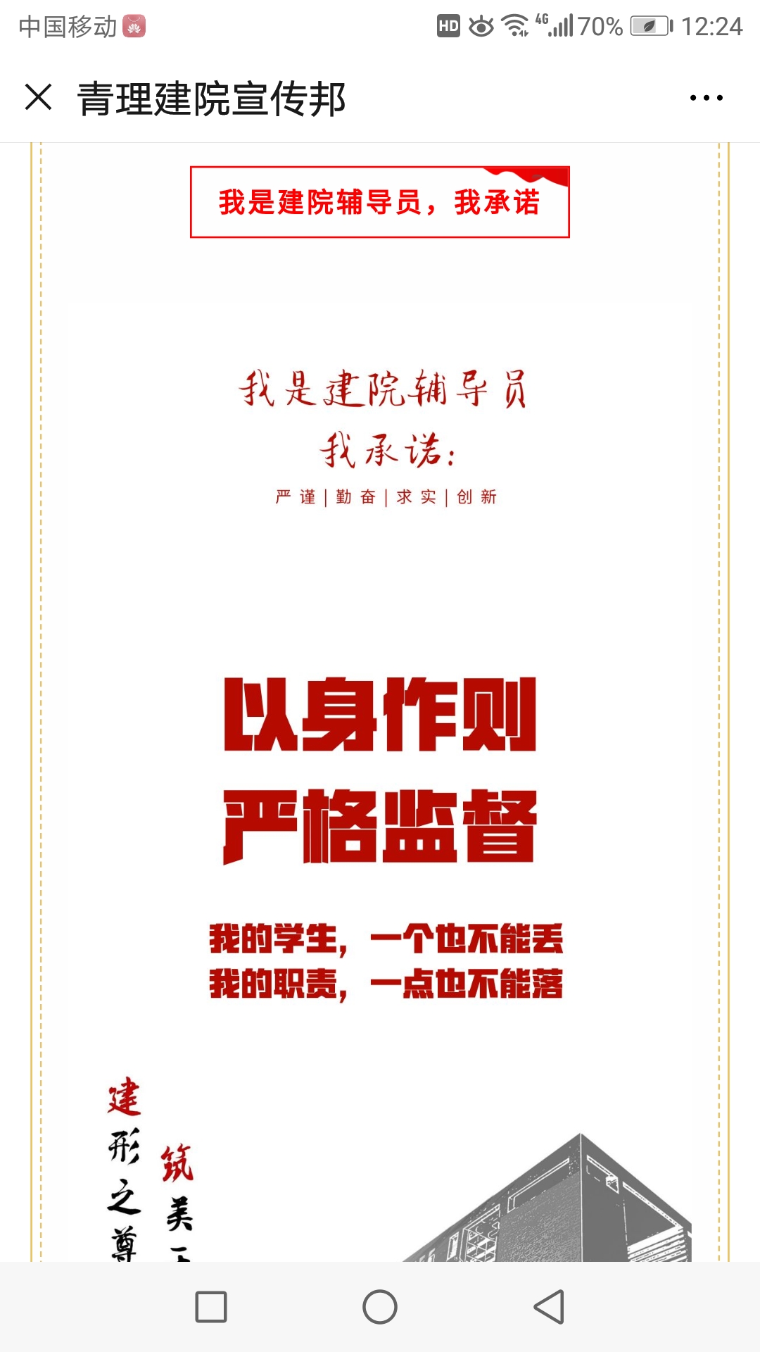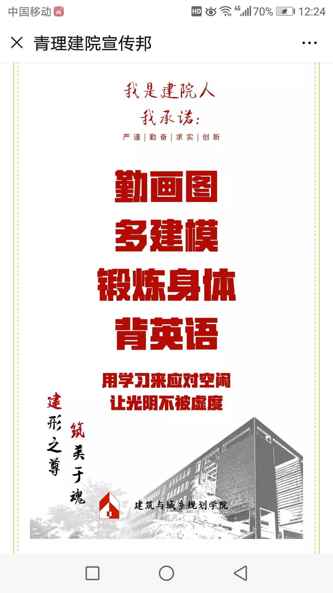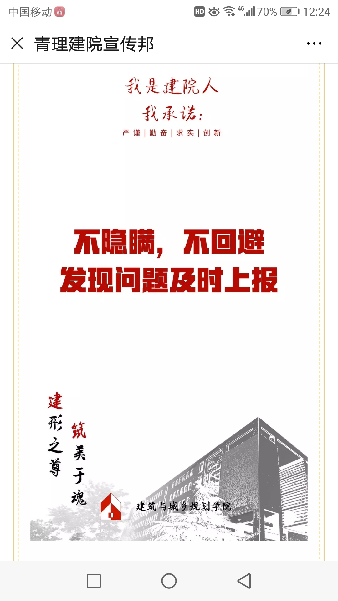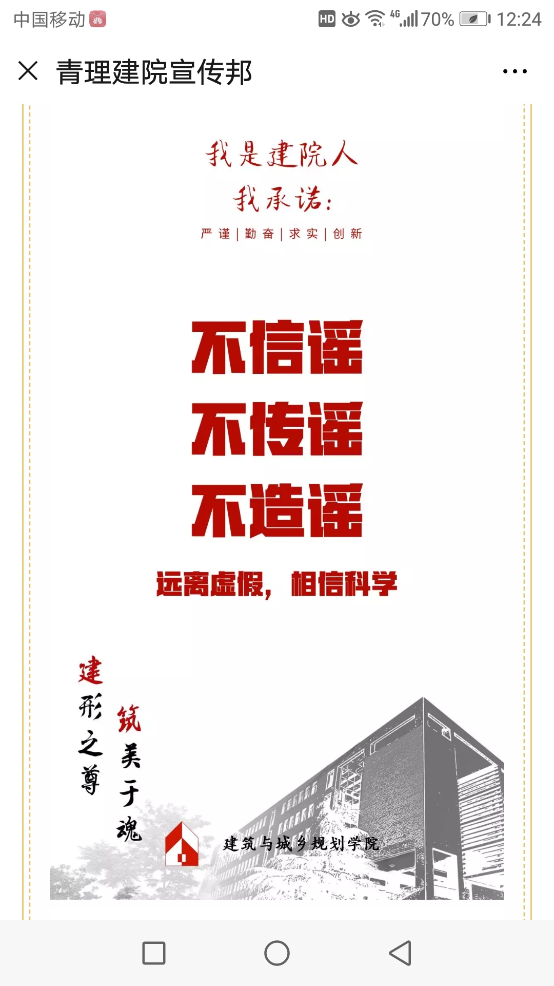 日前,在学院疫情防控工作领导小组的统一组织下,“我是建院人,我承诺!”网络宣传承诺活动在青理建院宣传邦微信公众号上发布,广大教师和学生积极响应,大家陆续在朋友圈转发起来,纷纷接力。大家通过微信平台,做出庄严承诺:我是建院人我承诺:出门戴口罩,回家勤洗手,平日不串门,朋友不聚餐;勤画图,多建模,锻炼身体,背英语;用学习应对空闲,光阴不被虚度;不信谣,不传谣,不造谣,远离虚假,相信科学;不隐瞒,不回避,发现问题及时上报;以身作则,严格监督,我的学生,一个也不能丢;我的职责,一点也不能落;配合学校积极防控;开学分隔两地,不如在家团聚。武汉加油!中国加油!