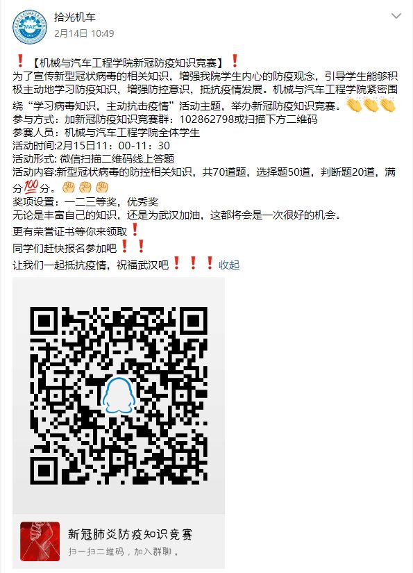在当前新型冠状病毒感染的肺炎疫情防控的严峻形势下,为深入宣传防疫相关知识,发挥青年学生在疫情防控工作中的责任和担当,发动学生更好普及防疫知识,近日,机械与汽车工程学院分团委组织开展防疫知识线上专题竞赛活动。