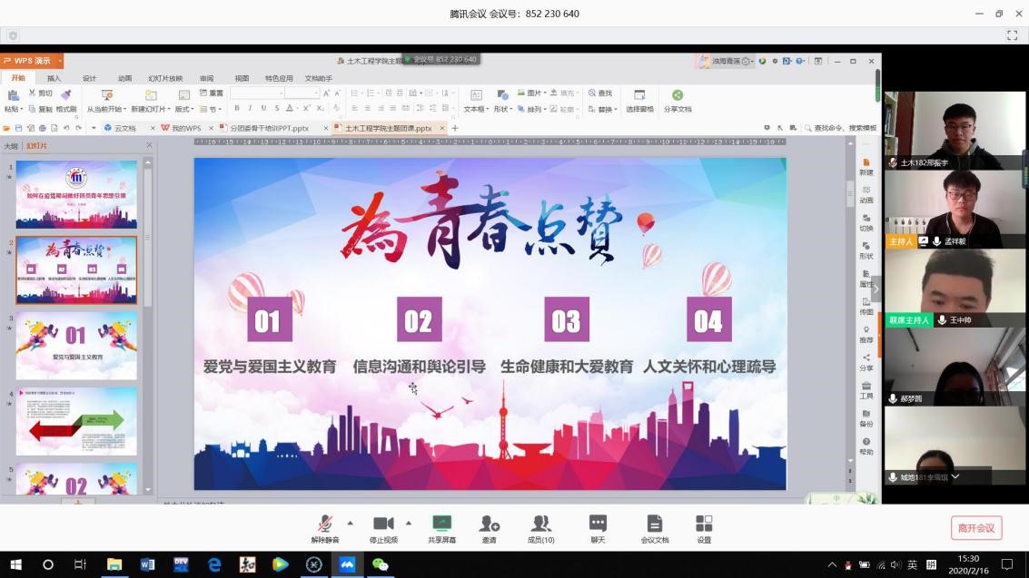 2月16日,土木工程学院分团委召开线上学团骨干主题团课。本次团课由学院学生工作办公室主任、分团委书记王中帅主讲,学院分团委委员、学生会骨干及各支部团支书代表参加团课学习。