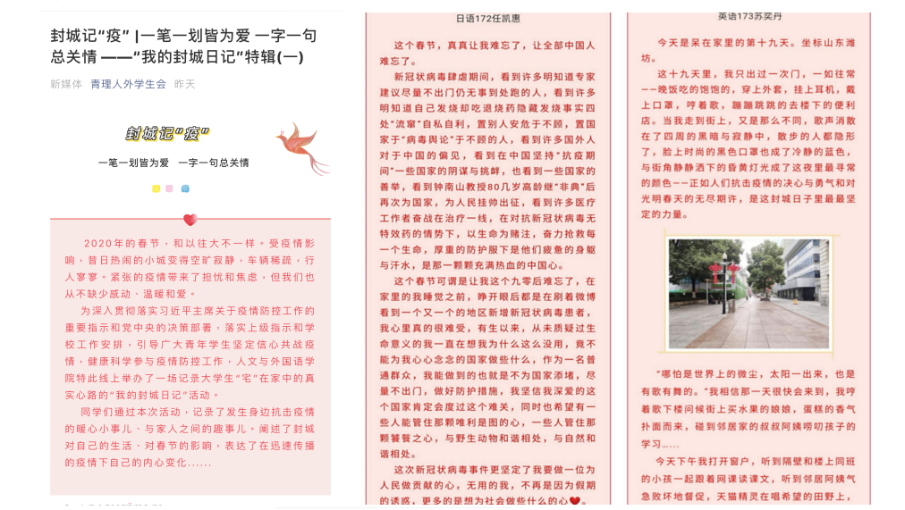 为深入贯彻落实习近平总书记关于疫情防控工作的重要指示和党中央的决策部署,引导广大青年学生坚定信心共战疫情,响应校团委“众志成城·共击疫情”系列主题团日活动,健康科学地参与疫情防控工作,人文与外国语学院分团委于2月10日,在线上发起记录大学生“宅”在家中真实心路历程的活动——“我的封城日记”。