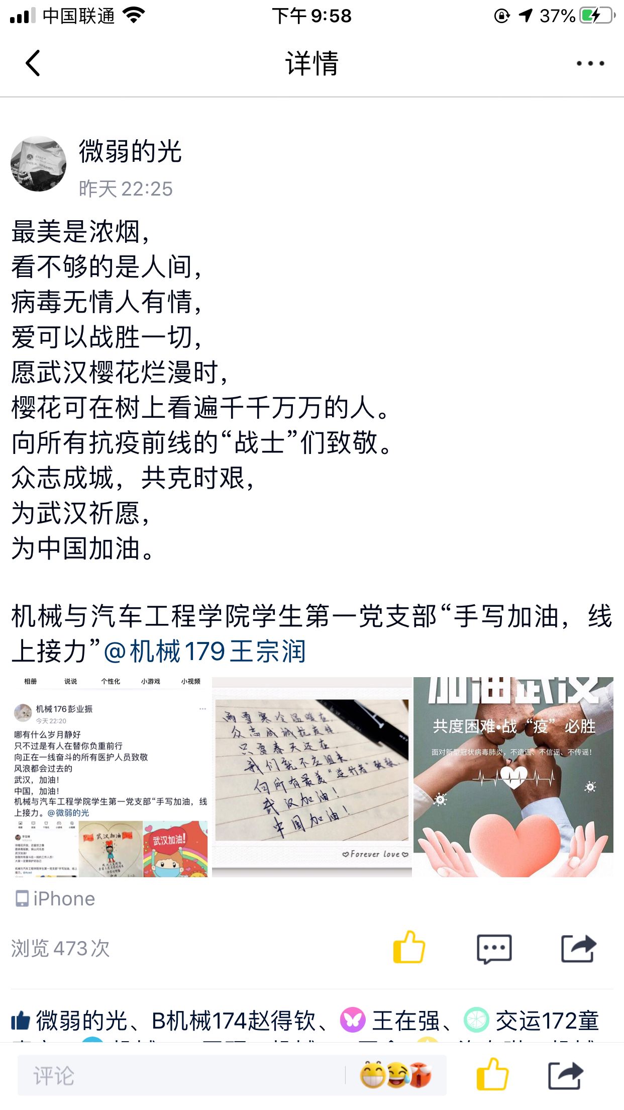 支部全体党员参与暖心接力活动,每条接力祝福平均浏览量达600余次,活动取得了良好的宣传效果,希望用我们的暖心手写祝福为在抗疫第一线奋战的医护人员、在武汉的全体同胞带来一丝鼓励和温暖。