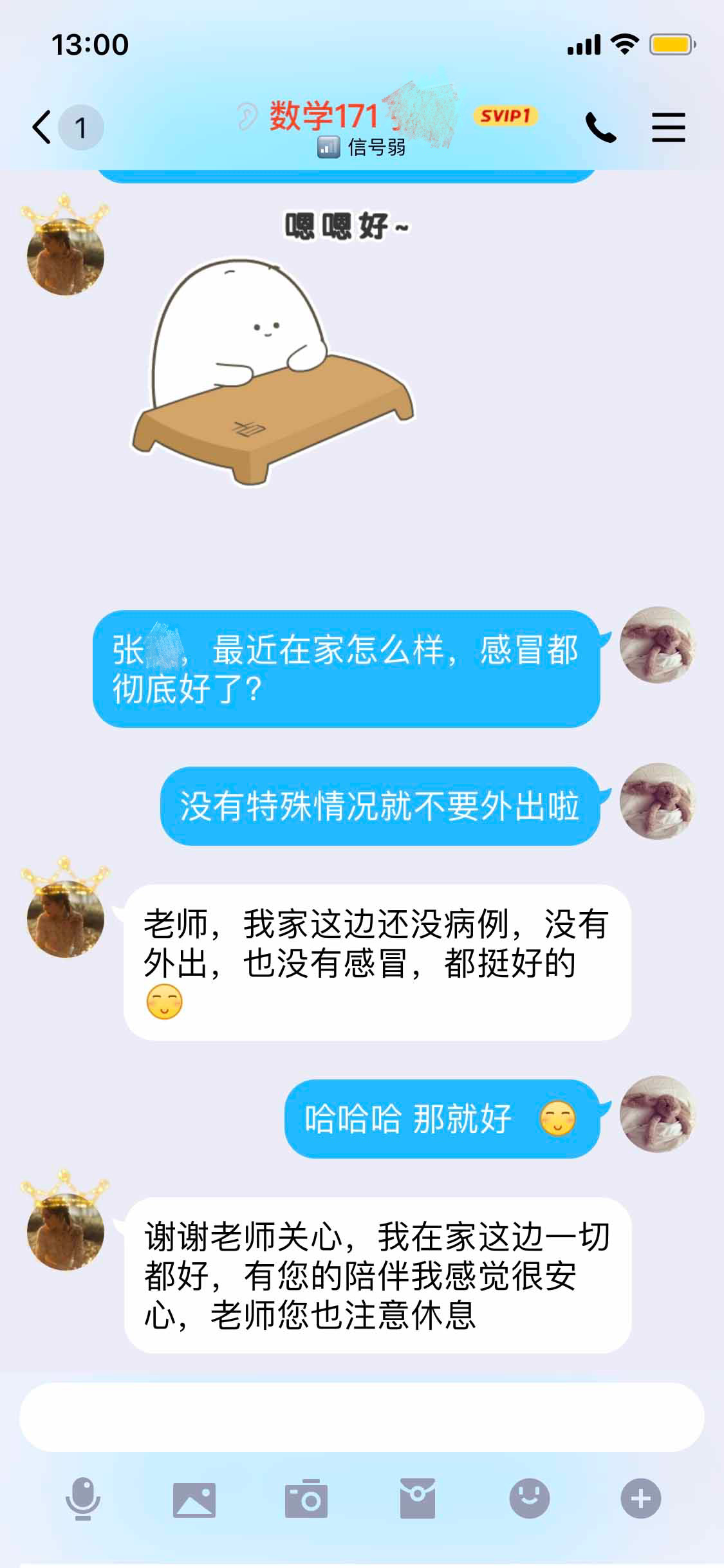 结合“心开始”网上谈心工作,全体辅导员还通过微信朋友圈、QQ等方式,积极将学校关于疫情防控的最新要求、学校的关心关爱传递给每一名学生。在这场防疫攻坚战中,理学院辅导员始终用心教导学生,用爱陪伴成长,与学生一同为迎接春暖花开的新学期做好准备。(撰稿:张晓双;审核:刘聘)