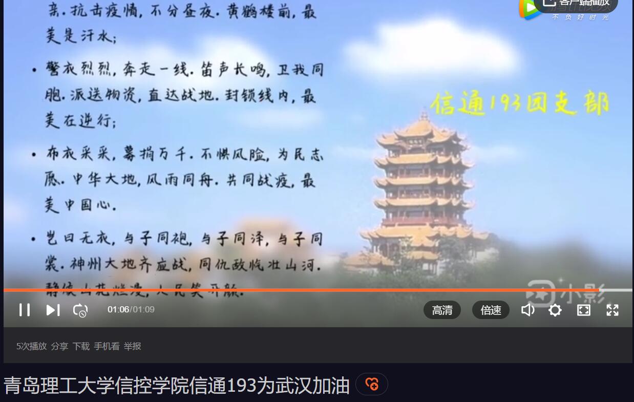各班级团支部针对“众志成城·共战疫情”主题开展了一系列团日活动,由班主任主持分批次召开视频会议,带领大家认真学习了《青岛理工大学致各位师生及广大校友的一封信》,每个人都承诺了严格遵守“48字”防控疫情守则,并强调学校下发的通知以及视频确认学生生活安全情况。各团支部根据自己班级的特点和需要开展了符合班级特色的主题团日活动,其中,通信182、电气183等团支部组织团员通过电子书籍、网课、远程学习等多种方式进行自主学习深造,充分利用慕课、图书馆数字资源等信息化教育资源提升综合素质,做到“停课不停学、学习不延期”。通信192团支部为了使同学们更加重视此次主题团日活动,也为了给武汉坚守在一线的医护人员们送去祝福,团支书卢嘉宁制作一部为武汉加油的短片(视频链接https://v.qq.com/x/page/g3069eub16p.html ),将通信192班每位同学在全国各地的祝福送给武汉,为此次抗疫,献出自己的力量。而信通193班全体同学积极响应号召,有的同学拿起画笔,一笔一画地表达出所思所想,有的同学操作电脑,尽管很多人之前从未制作过海报,但是他们主动从最基础的学起,将同学们的一张张海报,在歌曲《出征》的伴奏下,制作成视频(视频链接:https://v.qq.com/x/page/g3069i6iu9f.html ),“岂曰无衣,与子同裳”表现出团结一心,共同抗疫的决心。另外,机器人191团支部也别出心裁的制作了视频为战“疫”加油(视频链接https://v.qq.com/x/page/j3069q42dfn.html)。