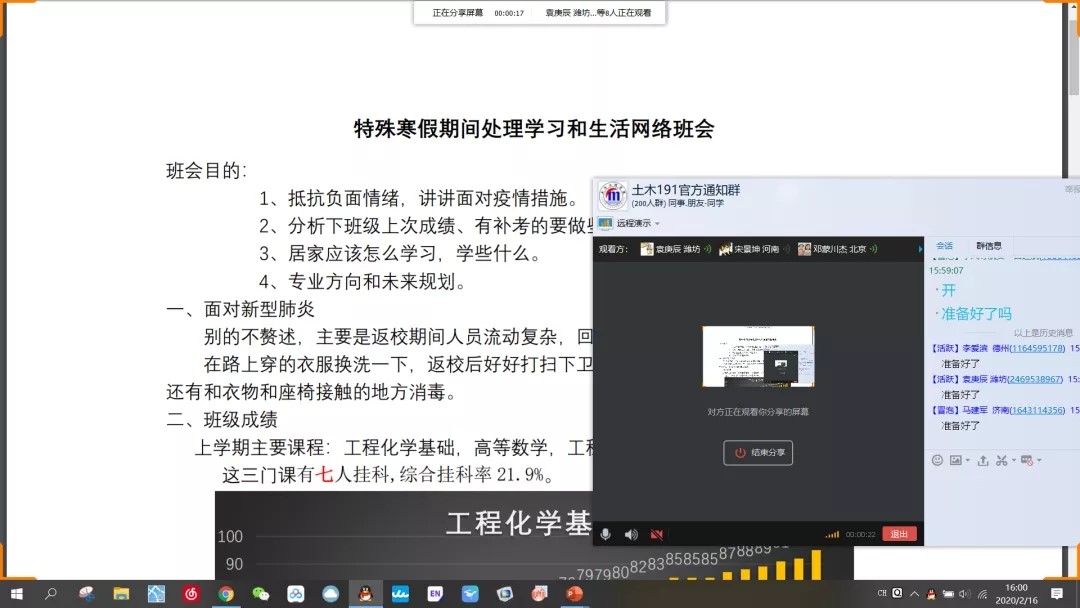 为贯彻落实习近平总书记关于打赢疫情防控阻击战的重要指示精神,根据学校、学院相关工作安排,土木工程学院学风导航员积极召开线上主题班会,结合所负责班级实际情况,指导班级开展学业辅导,引导同学们做好自身防护的同时,停课不停学,努力学习,用知识来充电,以最佳的身心状态打好这场疫情防控“阻击战”。