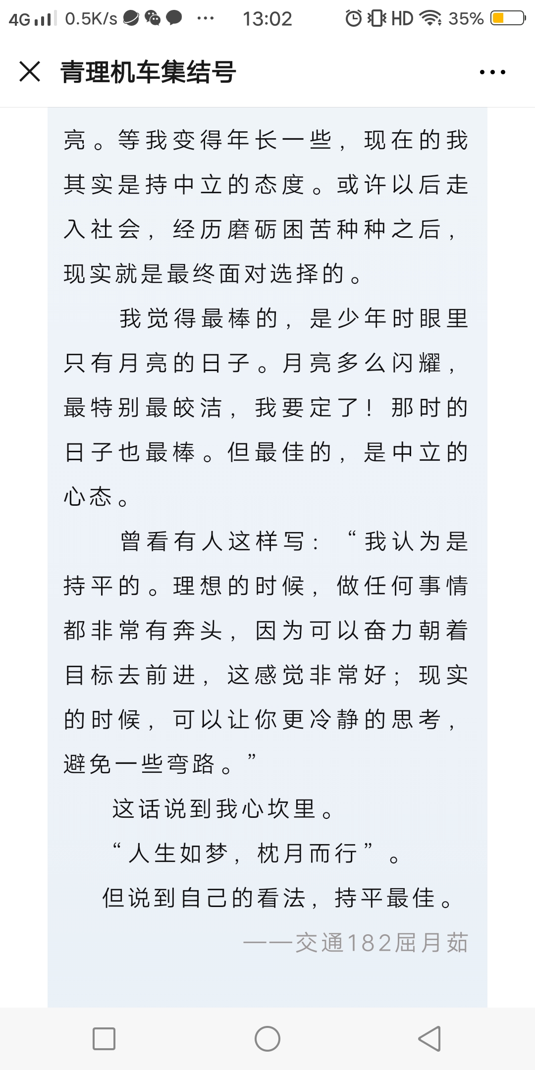 活动自发布以来,得到广大同学的积极参与,经过筛选,20名来自不同班级、不同专业的读书爱好者入选第一期共读小组成员。在为期两周的时间内,分成4 个小组,共读4 本由老师们推荐的书籍(《追风筝的人》、《月亮与六便士》、《围城》、《人生》),分享讨论了“理想”、“友谊”、“生活的意义”等八个不同的主题,完成了五千字左右的阅读“输出”。大家一起梳理斯特里克兰人生痕迹来探讨生活的意义,共同辨证高加林自我实现需求的正确性,在“城楼”上观望“进与出”的人们。在“生活的意义”主题讨论中,交运191的韩雪表示:“生活的意义应该是体验这世间的美好,来自亲人的关爱,朋友间的友谊,情侣间的爱情及旅途的美景,每一个都令我十分向往,偶尔写一段文字,晒一下朋友圈,不是为了炫耀,只是用来表达我生活的意义。”