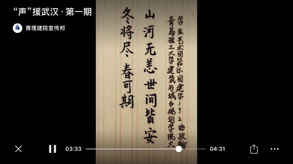 建筑与城乡规划学院大学生艺术团声乐团真情演唱以视频的方式生动呈现,视频的前3分钟聚焦抗疫前线,搜索生活中的闪光碎片,在抗疫的时光里拼凑出爱的模样。不畏艰险、英勇战斗、昼夜奋战,平凡英雄的抗疫故事令人感动。同时间赛跑、与病魔较量,方舱医院建设的中国速度让我们为之震撼,为之自豪。视频的后半段是依次来自礼仪队、器乐团、声乐团、舞蹈团、主持队各个成员的手写祝福。“没有一个冬天不可逾越,没有一个春天不会来临。”礼仪队成员朱雨晴如是说;“山河无恙,世间皆安。”是器乐团曲孜翰发自内心的祝福……以歌助战,凭字祈福。一声声振奋人心的歌声,一句句发自肺腑的祝福,代表着一颗颗牵挂疫情的赤诚之心,“声”援武汉,心系武汉,聚力加油,共克时艰。