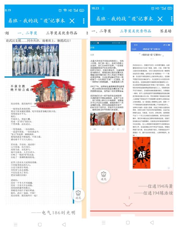 参与人员以自己的视角,列举身边发生的正能量事件、感恩语录、志愿者经历、在家防控经历、正能量小事等等,形式不限,配上图文发表在易班动态或班级微社区。短短几天时间,共113位同学参与活动,同学们表现出了对社会时事的热切关注,对突发公众事件的责任感和对学校工作的支持。经过后期工作站人员的认真地评选,最终评选一等奖三名,二等奖八名,三等奖十名。其中,一等奖由软件171张旭、电气186刘光明、机器人192谭晓倩摘得。张旭同学在他的短文中写道:“我相信我们很快就能解放,只要我们团结一心、众志成城就一定能度过难关,一起迈向新的时代,一起见证祖国的繁荣昌盛。”电气186刘光明诗中最后写道:“没有一个冬天不会逾越,没有一个春天不会来临。”用一首饱含深情的长诗抒发他对疫情中英勇作战战士的敬意。无论是流露真情的短文,还是文采斐然的长诗,亲手绘制的图画……同学们用自己的方式为在前线的奋战者致以敬意。