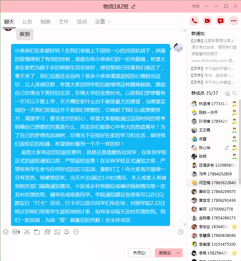 疫情无情,人有情,管理工程学院全体班主任积极响应号召,通过线上新媒体及时充分的融入学生群体,掌握学生情况,将关于疫情防控的工作要求、疫情防控知识传达到每一位学生,为保证学生身心健康、维护学校安全稳定贡献力量,为打赢青岛理工大学防控阻击战建牢班级第一道围墙。(撰稿:王云霞;审核:于利俊)