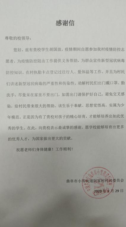疫情防控的关键时刻,在一线必有我们学生党员的身影。支部很多党员同志积极参与社区防疫工作,为抗击疫情添薪加火、勇担先锋。胡国放同志所在的村庄成立了多支疫情防控突击队,他作为党员突击队中的一员主力,先后参与了疫情宣传、卡口设岗、消毒灭源等工作。他的家乡对内向村民们送去粮食、蔬菜等生活必需品,对外向疫区人民募集了10万余元善款。