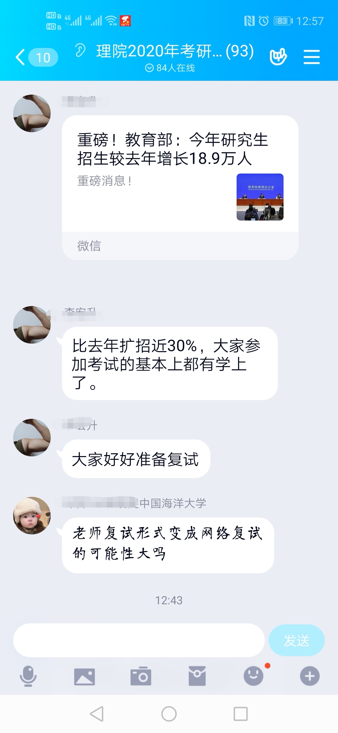 战“疫”时刻,停课不停教,为了更好的指导2020届毕业生考研复试,理学院专门成立考研复试指导群,班主任、辅导员以及往届毕业生全天候接受毕业生咨询。