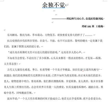 面对严峻的疫情局势,全体研究生同学响应国家和学校号召,承诺少出门、不聚集、不提前返校。同时,积极参加学校及学院组织的活动。2019级刘雅新同学创作出以防控抗疫为主题的作品《逆行背影》,旨在赞美那些奋斗在抗击疫情一线的医护人员。2018级王晓梅同学以笔为枪,创作了《余独不觉》,表达了她坚决与疫情奋战到底的决心。