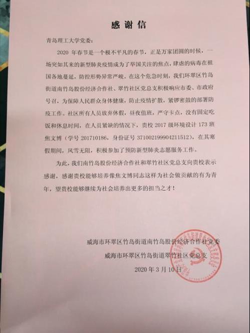 手拉手汇流成海,心连心筑起长城。3月10日,在威海全民抗击新冠肺炎疫情取得阶段性胜利的同时,青岛理工大学党委收到了威海市环翠区竹岛街道股份经济合作社党委和威海市环翠区竹岛街道翠竹社区党总支的一封感谢信,感谢学校培养了焦文博同志这样为社会做贡献的有为青年,期待青岛理工大学为社会培养更多英才。