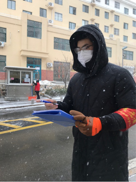 面对突如其来的新型冠状病毒感染的肺炎疫情,由威海市环翠区竹岛街道股份经济合作社党委和威海市环翠区竹岛街道翠竹社区党总支共同牵头组织的全区多名志愿者,坚守在疫情防控一线成为街头巷尾一到亮丽的风景线。身为入党积极分子,家住威海市环翠区崂山路的艺术与设计学院环境设计173班学生焦文博不畏疫情,主动请缨,志愿加入当地竹岛街道翠竹的疫情防控工作。从1月25日开始至2月18日,焦文博主动服务于疫情防控,落实各项防控举措。在加强自我防护的前提下,登记进入车辆、为每位人员测量体温,对所有场地进行消毒。春节期间寒风凛冽,许多时候焦文博手脚都冻僵了,但他从未想过放弃,始终坚守在岗位。