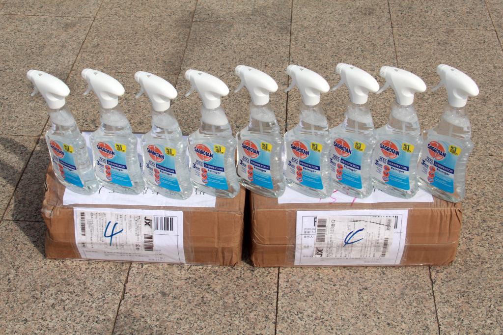 继2月11日收到2011级校友、土本115班学生田强强从德国捐赠2000只口罩后,3月15日,临沂校区再次收到其从德国寄来27瓶杀菌剂,用来支持校区疫情防控工作。