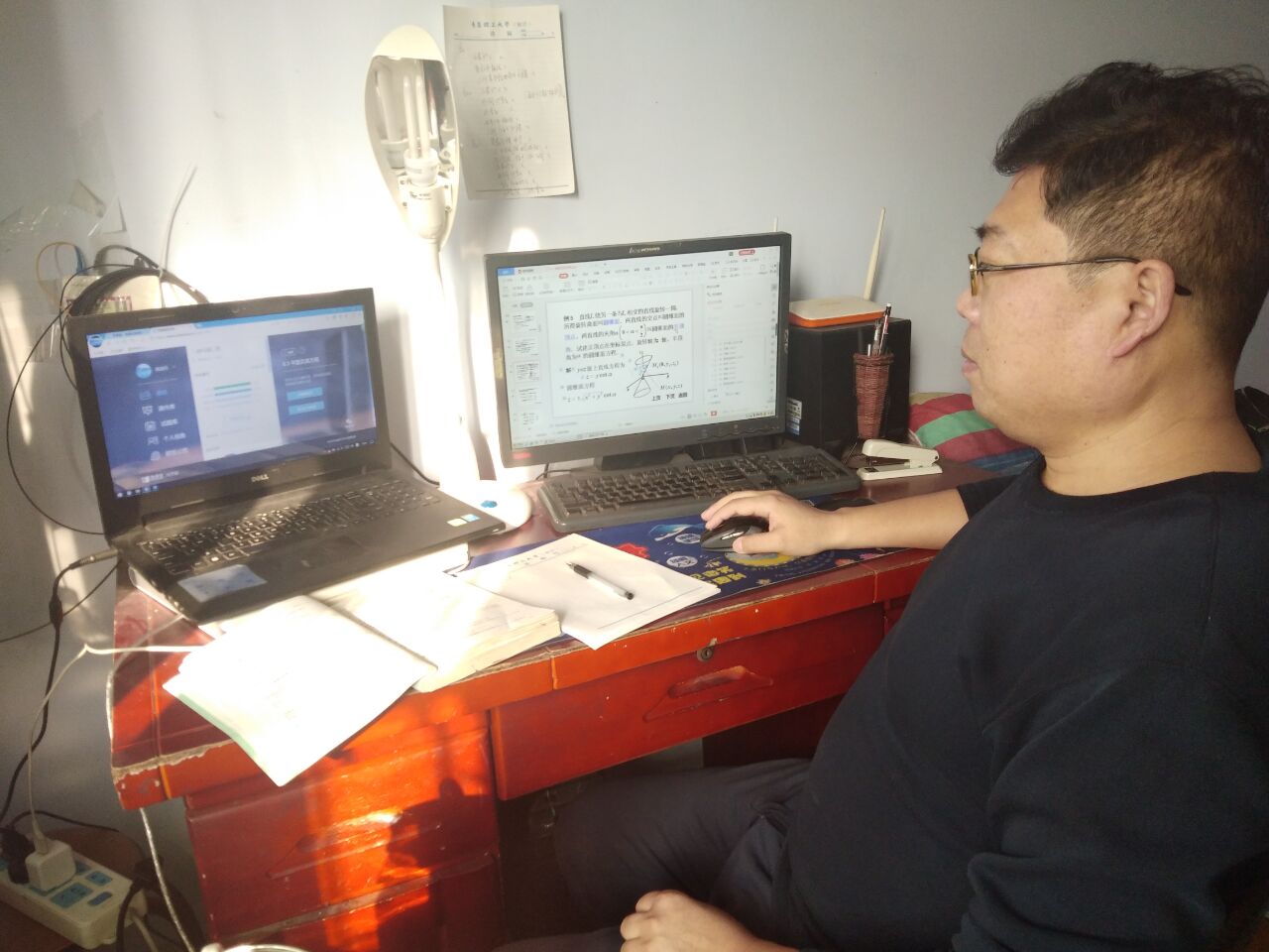 基础部数学教研室教师姚道洪老师本学期讲授的《高等数学》,对数字演算和板书推导过程要求较高,为了保证上课效果,姚老师专门准备了2台电脑,通过QQ群提前通知学生学习内容,通过雨课堂教学工具加强与学生的互动,在QQ群答疑解惑。按课表时间准时上线与学生交流,学生也积极反馈,互动活跃。
