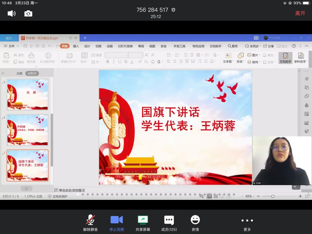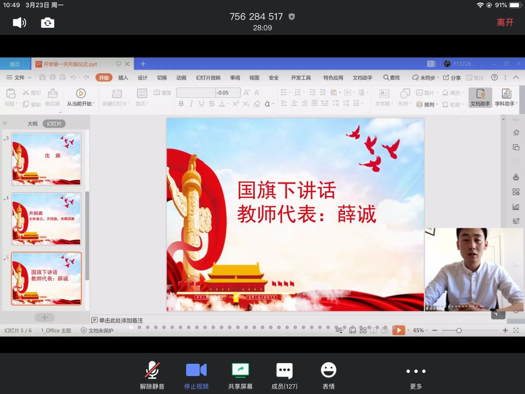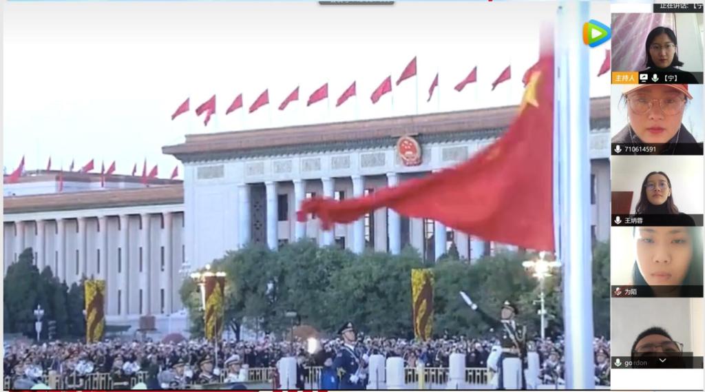 3月23日是青岛理工大学“线上开学”的第一天,商学院决定以“云端升旗”作为开学第一课,组织一次别开生面的“云端升旗”仪式,在对学生进行爱国主义教育的同时,也一同在国旗下立下一个flag:“为中华之崛起而读书,为国旗之荣誉而奋斗。”商学院党总支副书记董兰国、学生工作办公室主任兼分团委书记林丰艳、全体学生工作干部和商学院全院学生参加了本次云端升旗仪式。