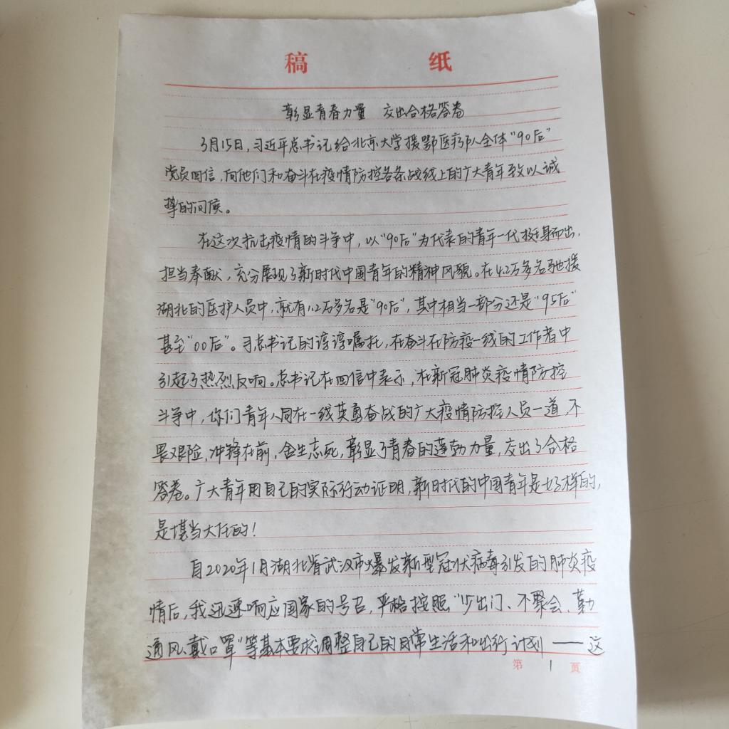会议伊始,邹佳欣简洁明了地阐述了此次会议的主题,希望大家在学习回信后能够意识到自己肩上的重任,并且号召大家在自己现在所处的环境中勇挑重担,发挥模范带头作用。而后,由预备党员戴纤朗读“习近平总书记给北京大学援鄂医疗队全体‘90后’党员的回信”。习近平总书记在回信中向北京大学援鄂医疗队“90后”党员和奋斗在疫情防控各条战线上的广大青年致以诚挚的问候,勉励广大青年不惧风雨、勇挑重担,让青春在党和人民最需要的地方绽放绚丽之花。“合格答卷”四个字饱含了习近平总书记的深情寄语和殷切嘱托,激励着各条战线上的广大青年人,为打赢疫情防控阻击战继续奋战、再立新功,为党和人民的事业作出新时代青年的贡献。