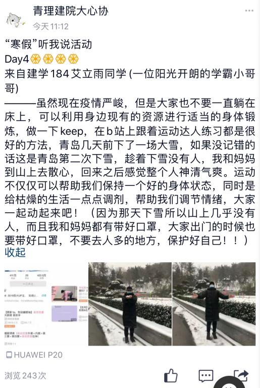 同心战“疫”,众克时艰。在参与“百团战‘疫’”为主题的线上防疫活动中,建学193李皓苒表示“非常开心自己能够通过参加社团活动为助力国家打赢防疫攻坚战贡献一份自己的力量,希望社团继续举办活动,吸引更多的人参加。”建学181胡苏宁转发青理大心协关于艾立雨的假期分享,并配文“人美心善”,传播抗击疫情正能量。建学191郑哲宁表示“营造社开展的特色抗‘疫’活动十分有趣,从中感受到了大家抗击疫情的团结力量,相信只要大家团结一心,众志成城,就一定可以早日战胜疫情。”