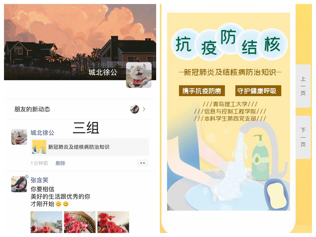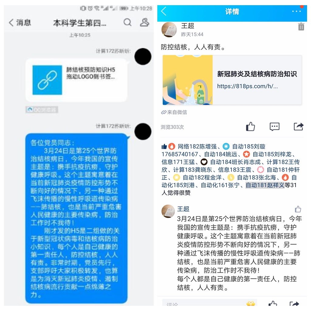 2020年3月24日是第25个“世界防治结核病日”。今年的宣传主题是“携手抗疫防痨,守护健康呼吸”。为贯彻落实党中央健康中国行动和当前抗击新型冠状病毒肺炎的决策部署,响应学院党总支的号召,深入开展防病宣传和健康教育,消除新型冠状病毒疫情、遏制结核病流行,提高同学们的健康意识,信息与控制工程学院本科学生四支部精心制作新型冠状病毒和结核病防治知识H5,开展“世界防治结核病日”线上宣传活动。