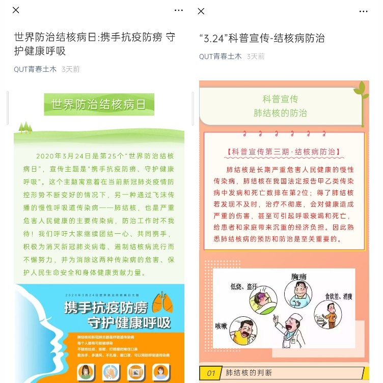 为确保同学们对结核病有充分的了解和认识,学院通过QUT青春土木微信公众平台、QQ空间等多渠道进行宣传,推送“结核病防治科普”“世界防治结核病日”宣传文章,就同学们最为关注的结核病传播方式、预防措施、肺结核治疗时国家给予的优惠政策等方面进行了详细介绍。防治肺结核日当天。开展线上结核病知识防治问答活动,同学们积极参与,超过九成的同学取得了八十分以上的成绩。知识科普宣传与线上问答相结合,帮助同学们巩固结核病防治知识,取得良好的效果。