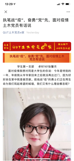 征文活动一经推出,学院学生支部党员积极响应,大家纷纷执笔,争做疫情防控大考的“执笔人”,表达对抗击疫情的信心和对一线工作人员的赞美。有的党员歌颂逆行战“疫”的英雄,为那些在疫情中感到恐慌的人们传达信心,带去信念;有的党员表达虽不能前往抗“疫”一线,但坚决服从国家安排,不乱跑,不添乱,宅家也能做贡献;有的党员表达了在党中央的正确领导下,全国人民必将战胜病毒的决心。学院也通过微信公众号“QUT土木党员e家”将党员们的文章进行展示,凝聚了正能量,起到了积极的引导、带动作用。