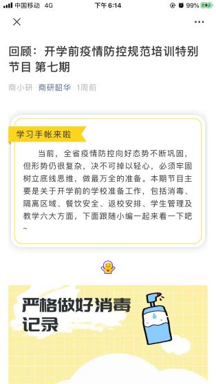 商学院研究生每日准时收看《开学前疫情防控规范培训特别节目》。各班采取多种形式进行观看总结,帮助学生熟练掌握相关知识。商研191班班长谢昕壕说:“防疫知识节目我一期不落的收看,这样学习下来发现自己不仅掌握到了更多的知识和细节,还能规范日常生活。”节目结束后,同学们对于此次的学习反响热烈,均有信心管理自己、服务他人,热切期望着春日的校园重逢。