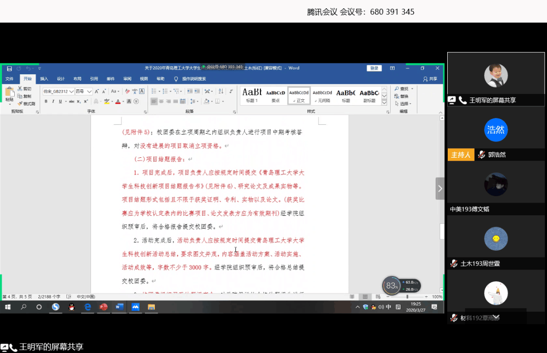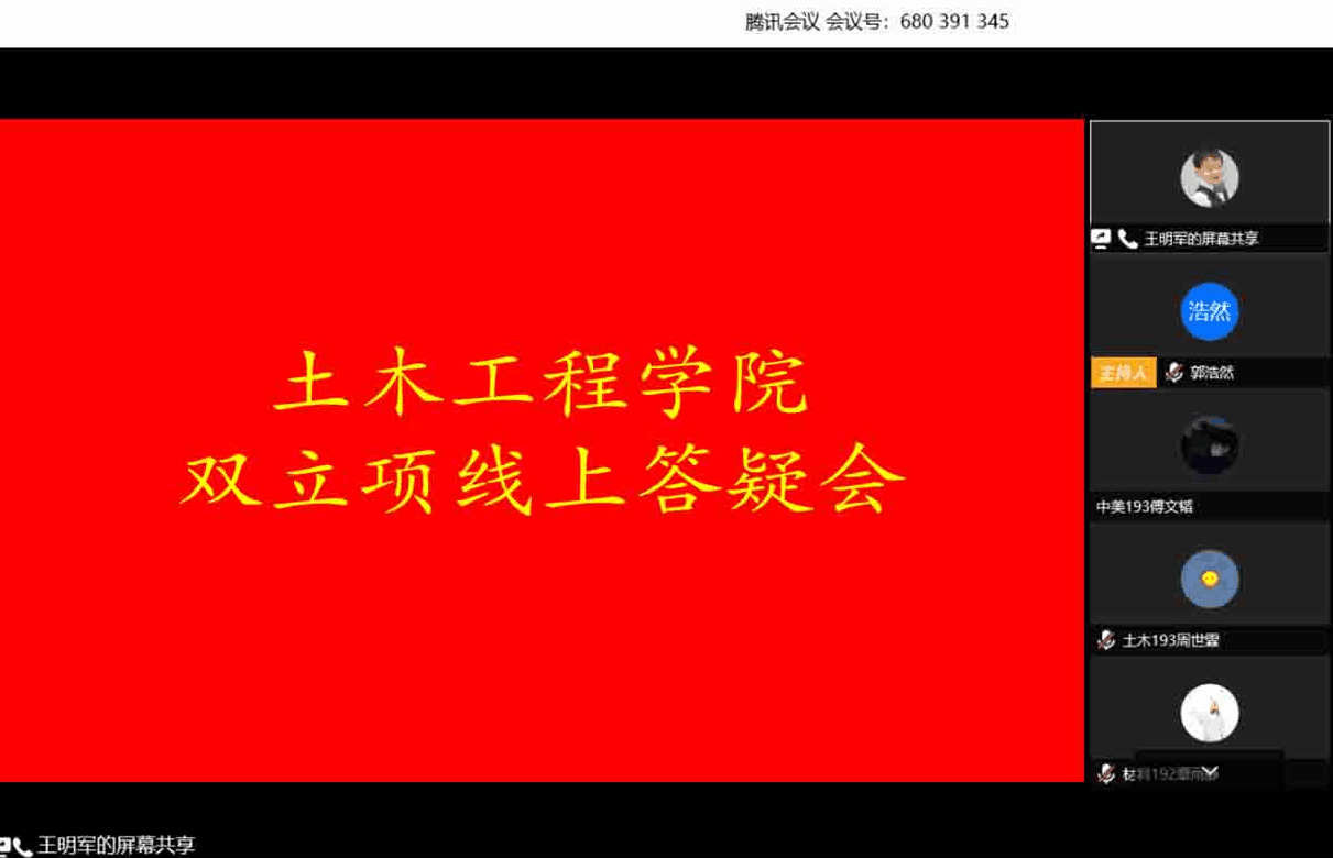 为加深同学们对大学生科技创新项目及科技创新活动立项申请的了解,提高同学们的科技创新热情,3月27日,土木工程学院举办大学生科技创新“双立项”线上答疑会,本次答疑会由科技立项优秀负责人王明军同学主讲。