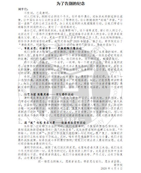 在倡议书中,商学院号召学子们将悲痛凝聚为斗志与力量,为中华之崛起而读书,为国旗之荣誉而奋斗,用自己的实际行动助力疫情防控工作,取得抗疫斗争的最后胜利,这是我们对逝去英烈的最好安慰,也是祈福中华的最佳践行。