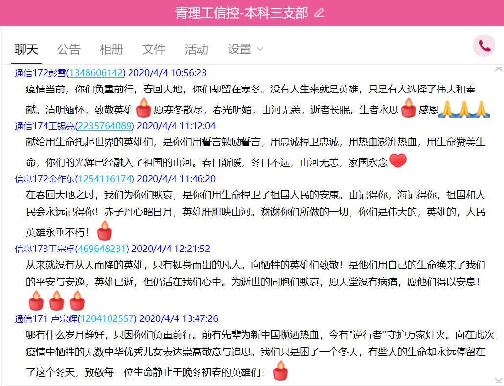 4月4日清明节上午,信息与控制工程学院各党支部开展“清明时节 遥祭英烈”线上缅怀活动,深切悼念抗击新冠肺炎疫情斗争牺牲烈士和逝世同胞。支部党员通过“云”祭奠,缅怀英烈,遥寄哀思。