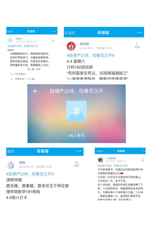 活动吸引了各学院同学的积极参与,截止到4月5日,活动已经进行过半,已有89名同学坚持每日打卡,同学们利用To Do List计划表、图片、文字、视频vlog等形式记录每日学习生活情况,累计打卡600余条,正逢清明节的到来,为缅怀烈士、纪念这个有着深远意义的日子,分站推出了清明特别版附加打卡活动,参赛成员可以线上抒发自己的清明哀思、展示清明节传统习俗,树立文明风尚。