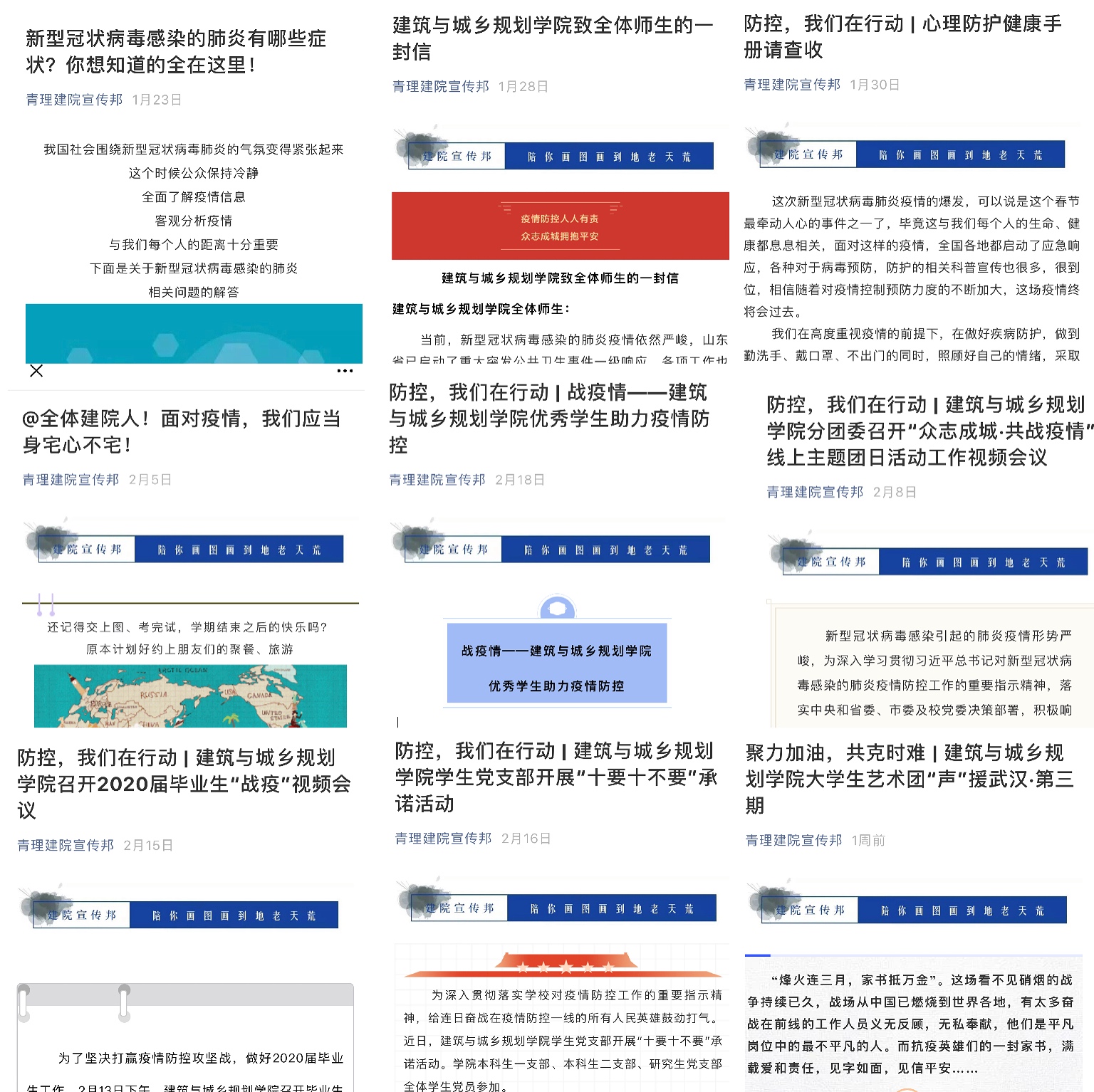本次疫情防控工作,学院充分利用了网络新媒体技术,跨越空间障碍,发挥线上实时互动的优势,各平台共推送疫情相关内容241篇,其中微信公众号(青理建院宣传邦、建筑学院学术部)累计推送101篇,学院官方QQ(建筑与城乡规划学院、青理工建院权益菌)累计推送39篇,易班平台累计推送101篇(其中微社区21篇),做好了学院防疫工作的宣传出口,协助全面做好疫情防护的信息发布和知识普及,展现了建院学子为抗击疫情贡献力量的信心和担当, 增强了特殊时期建筑与城乡规划学院的师生凝聚力与打好防疫战的信心。