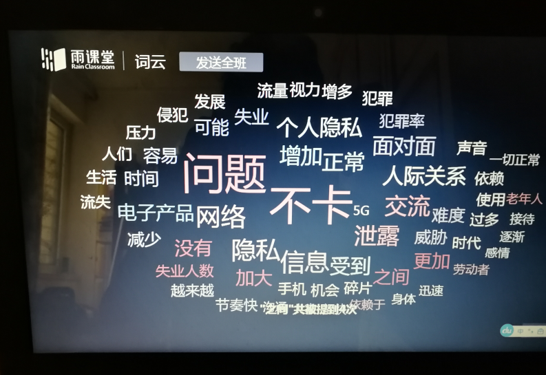 无论从给大一学生上的学科基础课《传播学理论》,还是给大三学生上的《新媒体广告案例》,学生的学习热情和学习效果没有明显弱化,反而在课堂互动环节,参与程度更高。随堂检测、课程作业的质量都比较理想。尤其是《新媒体广告案例》的课程作业,近半数团队的研究报告,远超过老师的期望值。(下图为第二周周四《传播学理论》课堂弹幕讨论词云图)