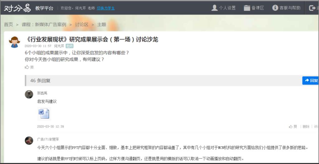 为了能够让每位同学都充分分享自己的建议和学习感受,课后专门在对分易平台开设了讨论区,并通过课程QQ群再次强调讨论任务。
