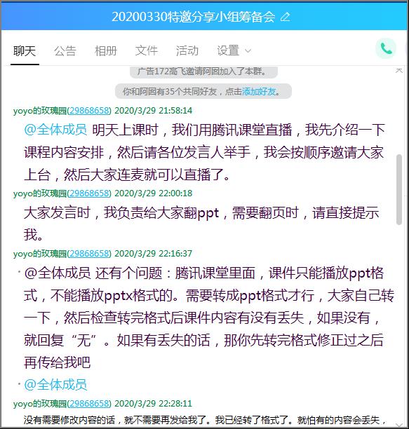 邀请6个分享团队的负责人和分享者,共同组成课前筹备会,以“20200330特邀分享小组筹备会QQ群”为平台,沟通交流课堂分享的直播平台、分享内容等诸多细节问题。并于课前进行了腾讯课堂直播模拟,以确保课堂分享能够顺利进行。