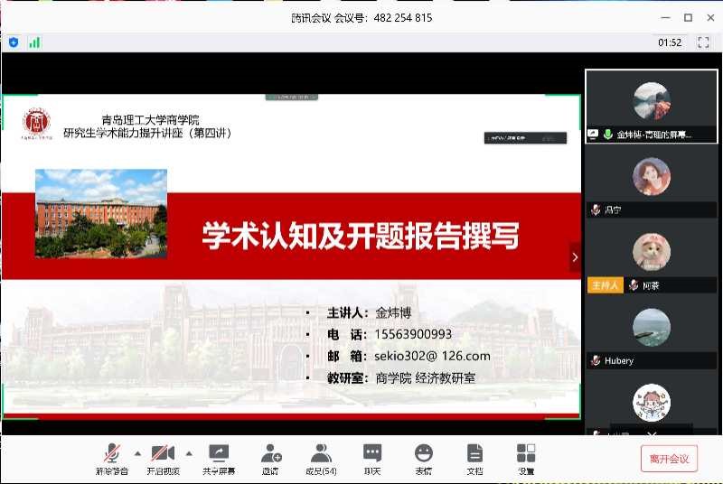 4月18日上午,商学院以腾讯会议为平台举办“研究生学术能力提升讲座(第四讲)”活动,本次活动由商学院研究生辅导员冯宁主持,邀请商学院经济教研室教师金炜博担任主讲,主讲题目:学术认知及开题报告撰写。商学院全体研究生参加本次讲座。