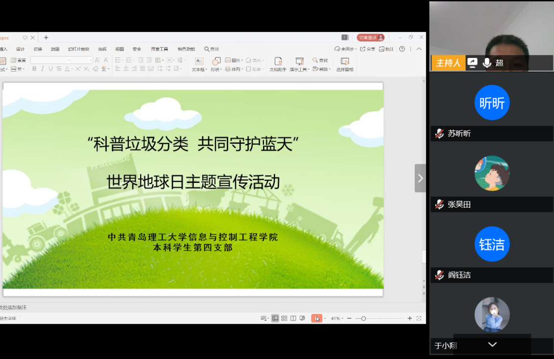 绿水青山就是金山银山。在第51个“世界地球日”来临之际,为了营造保护环境的良好氛围,树立起环保从我做起、从现在做起、从身边的小事做起的意识,4月16日,信息与控制工程学院本科学生四支部,通过腾讯会议开展“科普垃圾分类,共同守护蓝天”世界地球日线上主题宣传活动,将积极倡导垃圾分类工作融入到党建文化中,发挥党建引领作用,引导学生积极践行文明、节约、绿色、低碳的生活方式,共同建设和谐宜居的生态环境。