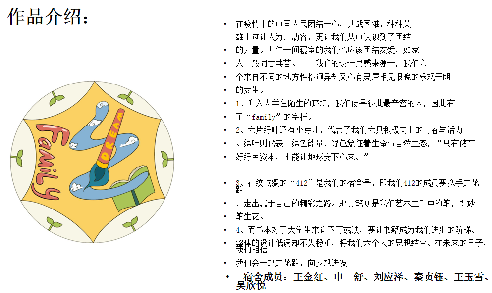 本次活动以宿舍为单位通过线上方式参加,自定义主题,自由发挥,设计相应符合本主题的海报或徽章(可手工绘制,可电脑绘制)并附上作品相关的代表意义和文字说明。